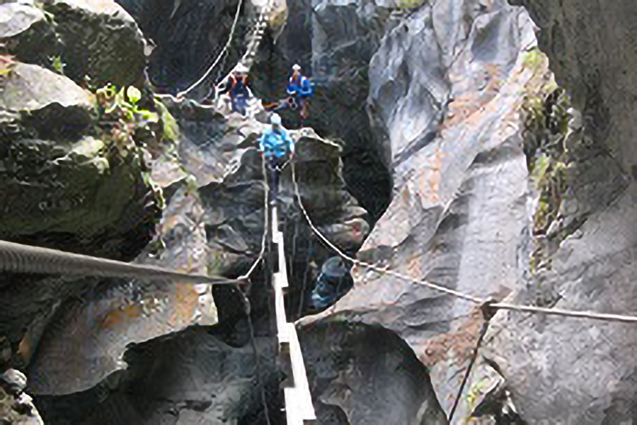 Auf der ganzen Tour ist man gesichert und hat nirgends Wasserkontakt, obwohl unten gewaltige Wassermassen tosen. Eine grossartige Tour.